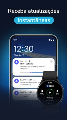 Abrace a segurança de ter byAir a monitorizar cada movimento. Com as suas capacidades de previsão de atrasos em tempo real, byAir antecipa possíveis interrupções, fornecendo-lhe informações vitais sobre aeronaves que se aproximam, permitindo-lhe reagir proactivamente. Mantenha-se informado com alertas instantâneos para alterações de portão, cancelamentos e outros desenvolvimentos cruciais, entregues diretamente no seu dispositivo, incluindo ecrãs principais, bloqueados ou através do seu smartwatch Wear OS para uma conveniência incomparável.