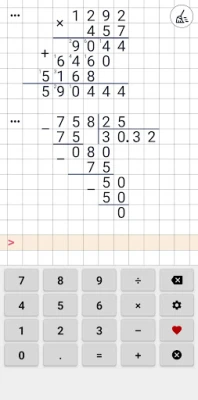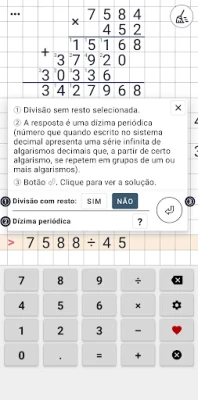 Explore uma calculadora de matemática fácil e divertida para resolver operações como divisão longa, multiplicação, adição e subtração. Obtenha resultados exibidos como se estivessem no papel, ideal para problemas complexos, incluindo divisões com resto ou decimais. Uma ferramenta completa para todas as suas contas.