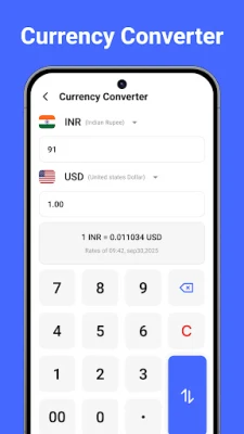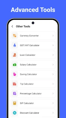 Além de sua funcionalidade pós-chamada, *Simple Calculator & Tools* é um verdadeiro centro de soluções numéricas. Execute todas as operações aritméticas fundamentais — adição, subtração, multiplicação e divisão — com botões responsivos e um display fácil de ler. Aprofunde-se em uma gama robusta de ferramentas avançadas, incluindo um prático Conversor de Moedas, Calculadoras de GST/IVA, Empréstimos, Salário, Poupança, Gorjetas, SIP, Descontos, Área por Unidade, IMC e até mesmo Idade. Cada função é projetada para ser precisa e diretamente aplicável às suas necessidades cotidianas, desde compras até planejamento financeiro.